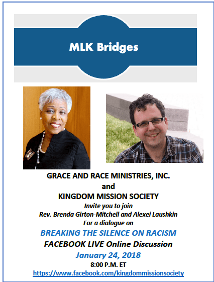 24th- Join Rev. Brenda Girton-Mitchell of Grace and Race Ministries Inc. and Alexei Laushkin of Kingdom Mission Society for a live webinar launching the initiative. 8pm ET. Tune-in on Facebook here. Send us a note at support@mlkbridges.com for a recorded copy of this conversation.